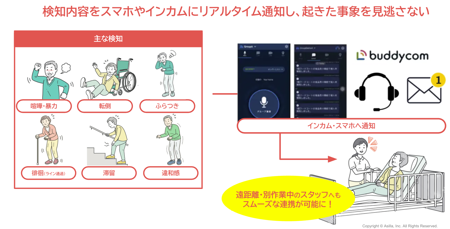 アジラはこれまで、AI警備システム「AI Security asilla」を通じて、商業施設やオフィスビルの安全管理を支援してきました。その知見と独自の行動認識AI技術を介護・福祉施設向けに発展させ、転倒・徘徊・体調急変など現場特有のリスクに特化した見守りソリューション「asilla care」を開発しました。