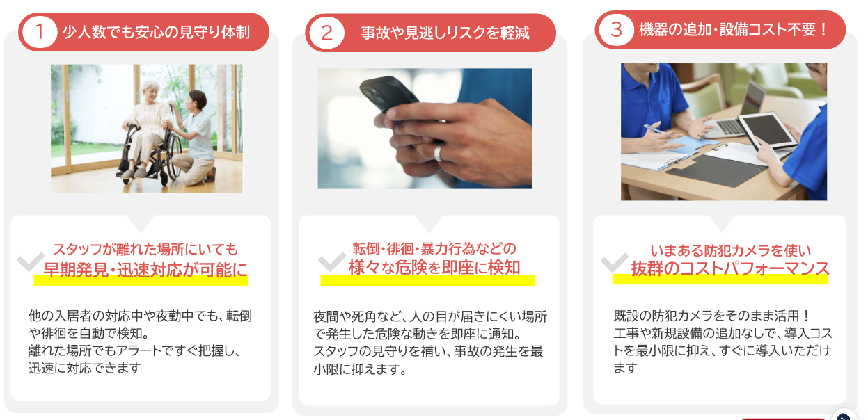 「asilla care」は、既設の防犯カメラをそのまま活用できるため新規設備の追加は不要で、導入コストや運用負担を抑えることができます。また、AIによるモニタリングにより、夜間や死角など人の目が届きにくい場面もAIが補うことで、24時間365日の安全な見守り体制の実現を目指します。