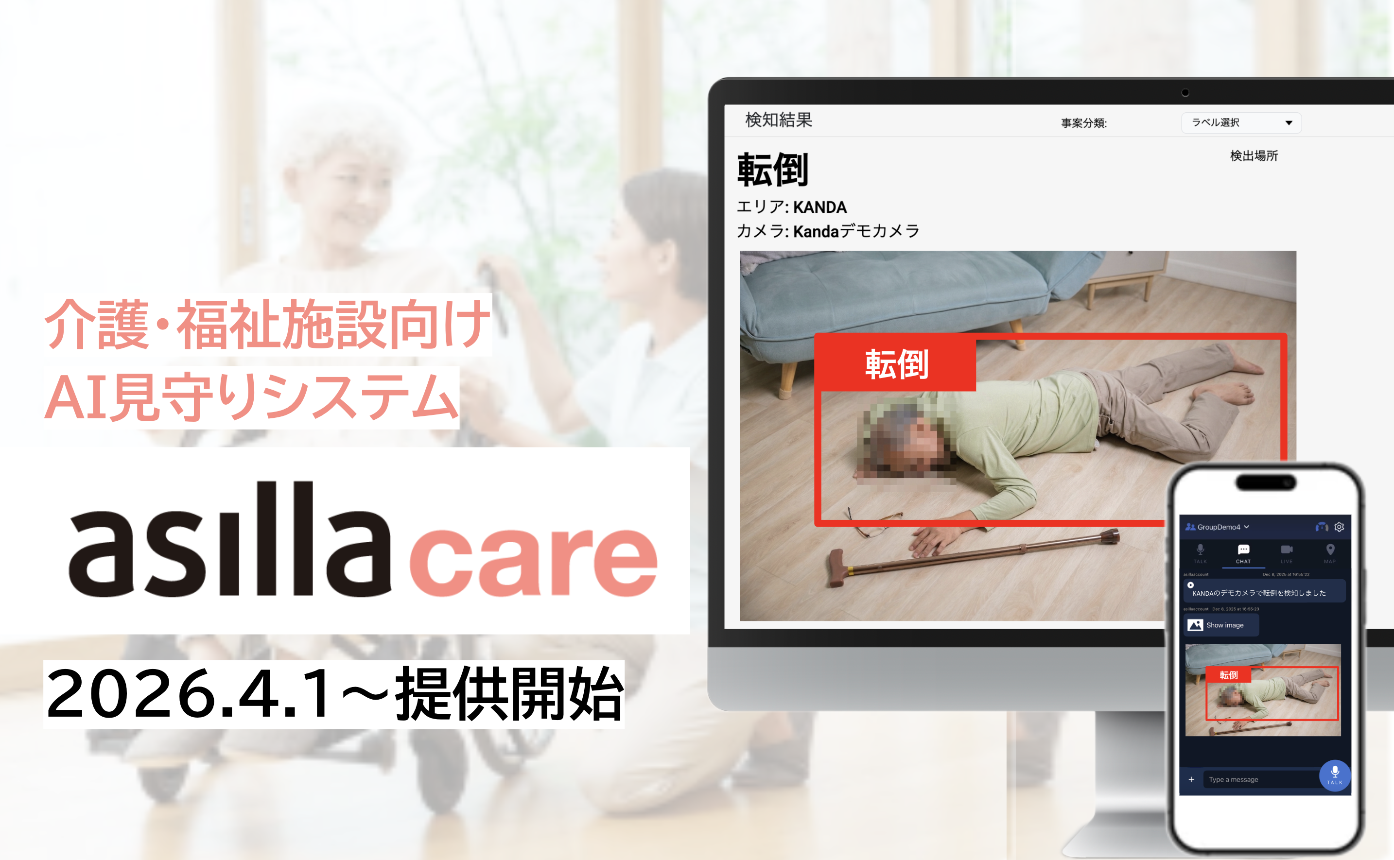「テクノロジーの力で安心で快適な世界へ」をビジョンに掲げる株式会社アジラ(本社:東京都町田市、代表取締役CEO 尾上 剛、以下「アジラ」)は、介護・福祉施設向けAI見守りシステム「asilla care」を、2026年4月1日より正式リリースしたことをお知らせします。
