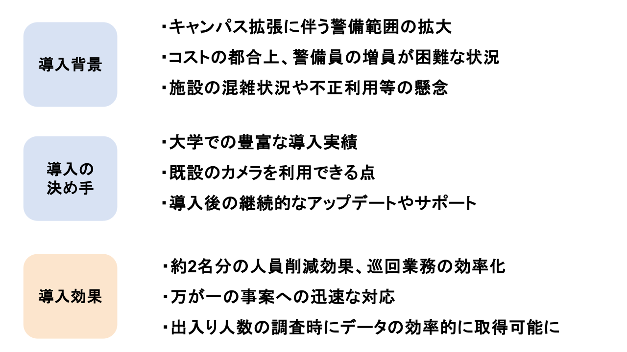 導入効果は非常に大きかったです。AIカメラが侵入検知やライン通過検知等を通じて常時監視してくれることで、警備員は本当に必要な場所に注力でき、限られた人員でもキャンパス全体の安全を維持できていると思います。