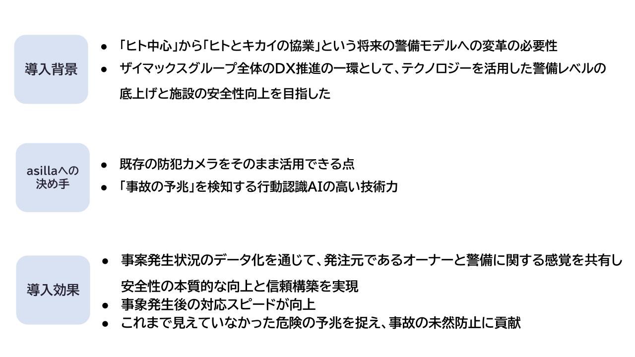 大きな変化がありました。例えばasillaが導入されている福岡の商業施設では、オーナー事業者の方々がasillaに非常に興味を持っています。オーナーは現地で起こっていることを事後的に報告を受けることが多い中で、asillaを活用すると異常事態の検出動画を基にリアルな情報提供ができるようになったため、オーナーと警備に関する感覚を共有できるようになりました。