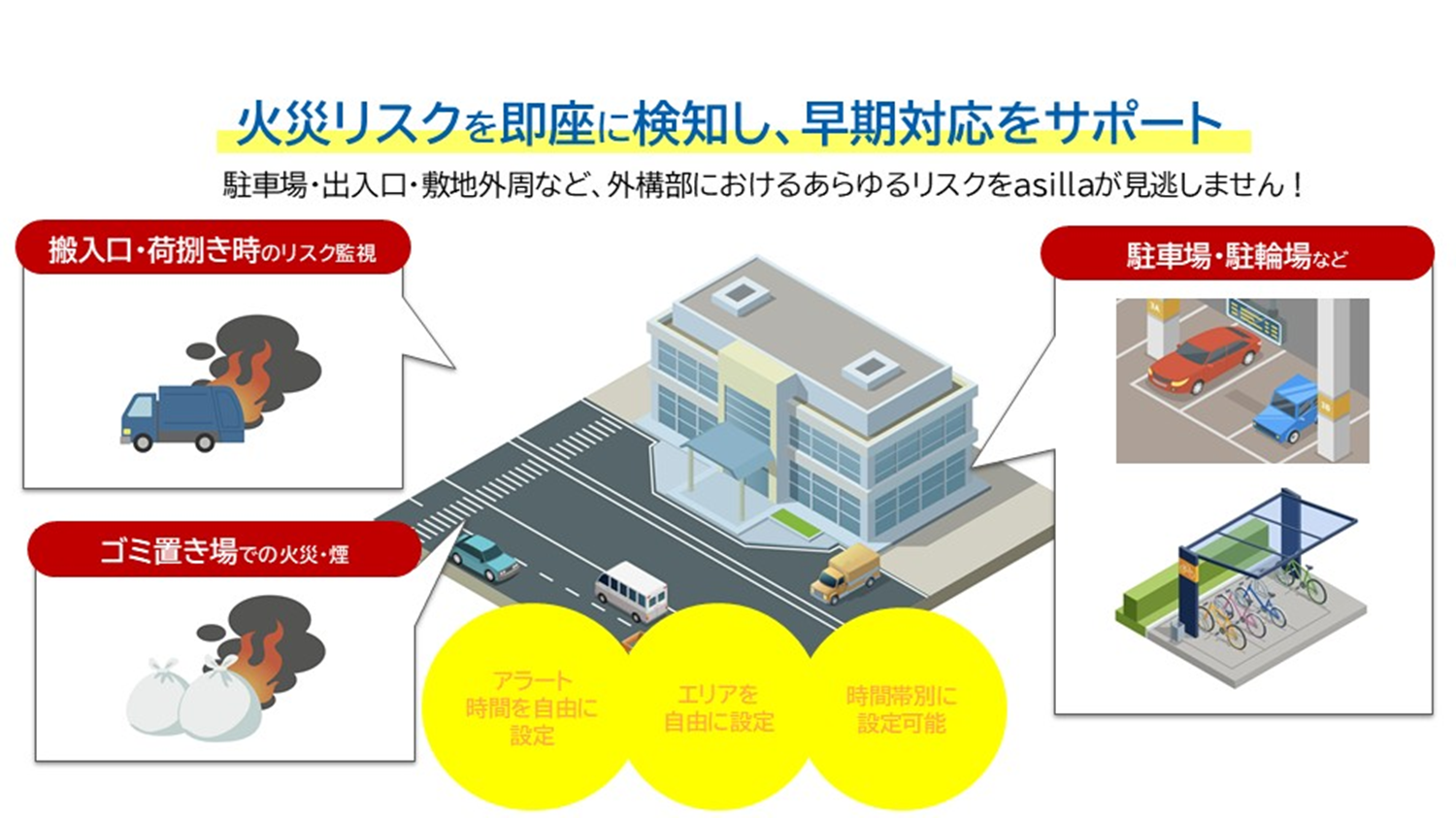 屋外や外構部、死角エリアなど、従来の消防設備や人の巡回だけでは把握が難しかった場所において、既存の監視カメラ映像を活用し、火煙の兆候を検知する機能を追加しました。これにより、施設内外を含めたより広範なエリアで、火災リスクの早期把握を支援します。